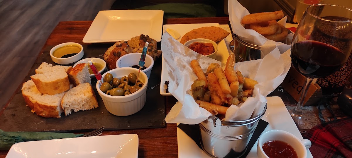 Like a kind of tapas bar. We had four plates to share including chicken and squid Came on a Tuesday evening in August Selected cocktails were two for £10 and this presented a reasonable choice and variety. Food very filling and three plates are plentiful Great location right in the heart of town and fully recommend - once down point and that was the weather ...